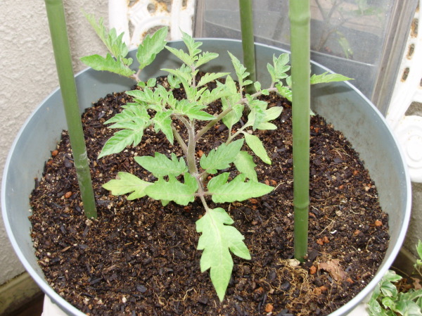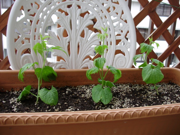 ゴーヤはこんな小さな苗でも、ものすごいゴーヤの匂いがする。取れたてのゴーヤが夏中食べられたら、結構、幸せかもかも(ワクワク)。トゲに気をつけ、大事に育ててあげよう。