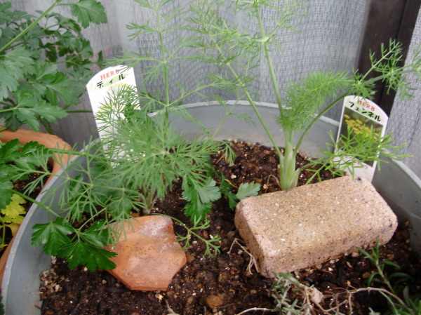 ハーブ類は、昨年から生き残っているローズマリーの横に、新顔のディルとフェンネルを一株づつ植えた。ディルをバターに混ぜ込んだ、ディルバターはすごくトーストに合うので大好き。収穫の時が楽しみ。フェンネルは魚料理に大活躍するけど、まだまだ株が小さいので収穫まで時間がかかりそう。